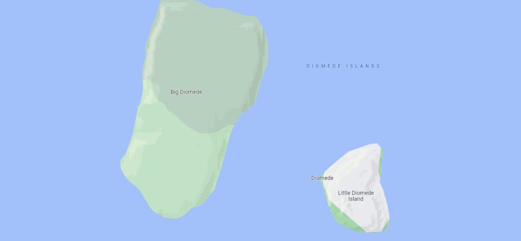 Insulele Diomede se află la o distanță de aproximativ 3,8 km una de cealaltă, dar insula cea mare este cu aproape o zi înaintea vecinei sale mai mici, deoarece se află de ambele părți ale liniei internaționale de demarcație.